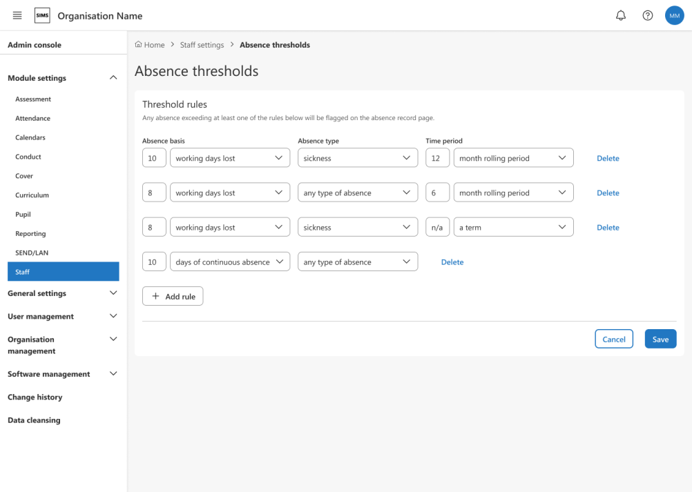 You can now set up custom rules in the Staff Absences module to highlight potential issues with staff absence. This feature helps schools intervene sooner, minimise disruption, and make more informed staffing decisions. It also supports staff wellbeing and gives students greater consistency in the classroom.