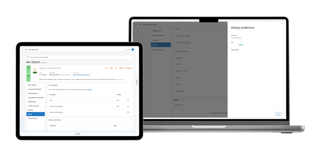 For office teams, our brand-new Meals section within the Pupil Profile makes it easier than ever to track allergies, dietary preferences, and free meal entitlements - helping schools support pupil wellbeing more effectively.